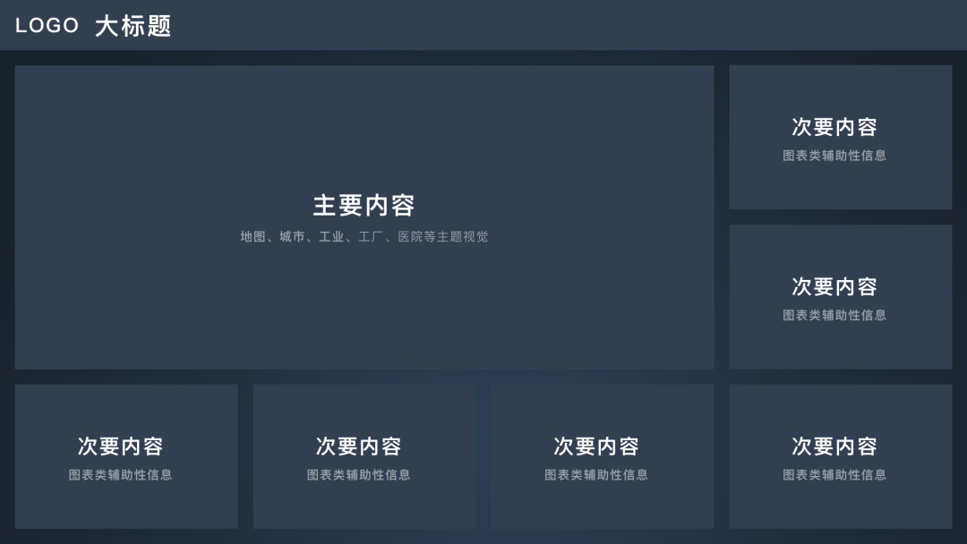 常见的大屏布局:居中结构、左右结构两种种常见的布局形式以常规的16:9模板为例,下面列举的一些常见的布局形式,供大家参考。