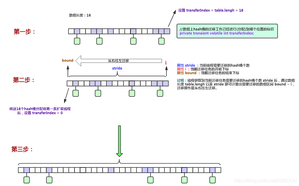 //调用该扩容方法的地方有://java.util.concurrent.ConcurrentHashMap#addCount 向集合中插入新数据后更新容量计数时发现到达扩容阈值而触发的扩容//java.util.concurrent.ConcurrentHashMap#helpTransfer 扩容状态下其他线程对集合进行插入、修改、删除、合并、compute 等操作时遇到 ForwardingNode 节点时触发的扩容//java.util.concurrent.ConcurrentHashMap#tryPresize putAll批量插入或者插入后发现链表长度达到8个或以上,但数组长度为64以下时触发的扩容private final void transfer(Node<K,V>[] tab, Node<K,V>[] nextTab) {int n = tab.length, stride;//计算每条线程处理的桶个数,每条线程处理的桶数量一样,如果CPU为单核,则使用一条线程处理所有桶//每条线程至少处理16个桶,如果计算出来的结果少于16,则一条线程处理16个桶if ((stride = (NCPU > 1) ? (n >>> 3) / NCPU : n) < MIN_TRANSFER_STRIDE)stride = MIN_TRANSFER_STRIDE; // subdivide rangeif (nextTab == null) { // 初始化新数组(原数组长度的2倍)try {@SuppressWarnings("unchecked")Node<K,V>[] nt = (Node<K,V>[])new Node<?,?>[n << 1];nextTab = nt;} catch (Throwable ex) { // try to cope with OOMEsizeCtl = Integer.MAX_VALUE;return;}nextTable = nextTab;//将 transferIndex 指向最右边的桶,也就是数组索引下标最大的位置transferIndex = n;}int nextn = nextTab.length;//新建一个占位对象,该占位对象的 hash 值为 -1 该占位对象存在时表示集合正在扩容状态,key、value、next 属性均为 null ,nextTable 属性指向扩容后的数组//该占位对象主要有两个用途:// 1、占位作用,用于标识数组该位置的桶已经迁移完毕,处于扩容中的状态。// 2、作为一个转发的作用,扩容期间如果遇到查询操作,遇到转发节点,会把该查询操作转发到新的数组上去,不会阻塞查询操作。ForwardingNode<K,V> fwd = new ForwardingNode<K,V>(nextTab);//该标识用于控制是否继续处理下一个桶,为 true 则表示已经处理完当前桶,可以继续迁移下一个桶的数据boolean advance = true;//该标识用于控制扩容何时结束,该标识还有一个用途是最后一个扩容线程会负责重新检查一遍数组查看是否有遗漏的桶boolean finishing = false; // to ensure sweep before committing nextTab//这个循环用于处理一个 stride 长度的任务,i 后面会被赋值为该 stride 内最大的下标,而 bound 后面会被赋值为该 stride 内最小的下标//通过循环不断减小 i 的值,从右往左依次迁移桶上面的数据,直到 i 小于 bound 时结束该次长度为 stride 的迁移任务//结束这次的任务后会通过外层 addCount、helpTransfer、tryPresize 方法的 while 循环达到继续领取其他任务的效果for (int i = 0, bound = 0;;) {Node<K,V> f; int fh;while (advance) {int nextIndex, nextBound;//每处理完一个hash桶就将 bound 进行减 1 操作if (--i >= bound || finishing)advance = false;else if ((nextIndex = transferIndex) <= 0) {//transferIndex <= 0 说明数组的hash桶已被线程分配完毕,没有了待分配的hash桶,将 i 设置为 -1 ,后面的代码根据这个数值退出当前线的扩容操作i = -1;advance = false;}//只有首次进入for循环才会进入这个判断里面去,设置 bound 和 i 的值,也就是领取到的迁移任务的数组区间else if (U.compareAndSwapInt(this, TRANSFERINDEX, nextIndex, nextBound = (nextIndex > stride ? nextIndex - stride : 0))) {bound = nextBound;i = nextIndex - 1;advance = false;}}if (i < 0 || i >= n || i + n >= nextn) {int sc;//扩容结束后做后续工作,将 nextTable 设置为 null,表示扩容已结束,将 table 指向新数组,sizeCtl 设置为扩容阈值if (finishing) {nextTable = null;table = nextTab;sizeCtl = (n << 1) - (n >>> 1);return;}//每当一条线程扩容结束就会更新一次 sizeCtl 的值,进行减 1 操作if (U.compareAndSwapInt(this, SIZECTL, sc = sizeCtl, sc - 1)) {//(sc - 2) != resizeStamp(n) << RESIZE_STAMP_SHIFT 成立,说明该线程不是扩容大军里面的最后一条线程,直接return回到上层while循环if ((sc - 2) != resizeStamp(n) << RESIZE_STAMP_SHIFT)return;//(sc - 2) == resizeStamp(n) << RESIZE_STAMP_SHIFT 说明这条线程是最后一条扩容线程//之所以能用这个来判断是否是最后一条线程,因为第一条扩容线程进行了如下操作:// U.compareAndSwapInt(this, SIZECTL, sc, (rs << RESIZE_STAMP_SHIFT) + 2)//除了修改结束标识之外,还得设置 i = n; 以便重新检查一遍数组,防止有遗漏未成功迁移的桶finishing = advance = true;i = n; // recheck before commit}}else if ((f = tabAt(tab, i)) == null)//遇到数组上空的位置直接放置一个占位对象,以便查询操作的转发和标识当前处于扩容状态advance = casTabAt(tab, i, null, fwd);else if ((fh = f.hash) == MOVED)//数组上遇到hash值为MOVED,也就是 -1 的位置,说明该位置已经被其他线程迁移过了,将 advance 设置为 true ,以便继续往下一个桶检查并进行迁移操作advance = true; // already processedelse {synchronized (f) {if (tabAt(tab, i) == f) {Node<K,V> ln, hn;//该节点为链表结构if (fh >= 0) {int runBit = fh & n;Node<K,V> lastRun = f;//遍历整条链表,找出 lastRun 节点for (Node<K,V> p = f.next; p != null; p = p.next) {int b = p.hash & n;if (b != runBit) {runBit = b;lastRun = p;}}//根据 lastRun 节点的高位标识(0 或 1),首先将 lastRun设置为 ln 或者 hn 链的末尾部分节点,后续的节点使用头插法拼接if (runBit == 0) {ln = lastRun;hn = null;}else {hn = lastRun;ln = null;}//使用高位和低位两条链表进行迁移,使用头插法拼接链表for (Node<K,V> p = f; p != lastRun; p = p.next) {int ph = p.hash; K pk = p.key; V pv = p.val;if ((ph & n) == 0)ln = new Node<K,V>(ph, pk, pv, ln);elsehn = new Node<K,V>(ph, pk, pv, hn);}//setTabAt方法调用的是 Unsafe 类的 putObjectVolatile 方法//使用 volatile 方式的 putObjectVolatile 方法,能