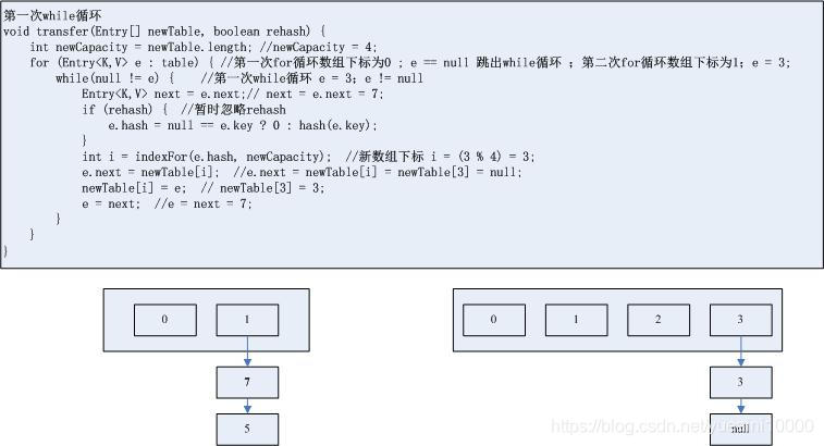 void transfer(Entry[] newTable, boolean rehash) {int newCapacity = newTable.length; //newCapacity = 4;for (Entry<K,V> e : table) { //第一次for循环数组下标为0 ; e == null 跳出while循环 ;第二次for循环数组下标为1;e = 3;while(null != e) { // 第二次while 循环 e = 7; e != null;Entry<K,V> next = e.next;// next = e.next = 5;if (rehash) { //暂时忽略rehashe.hash = null == e.key ? 0 : hash(e.key);}int i = indexFor(e.hash, newCapacity); //新数组下标 i = (7 % 4) = 3;//e.next = newTable[i] = newTable[3] = 3;//这里要清楚newTable[3]的值已经是新数组中的3.//因此这一步的操作实际上是把当前的e(7)的next指针指向了3. -也就是常说的头部插入法e.next = newTable[i];newTable[i] = e; //newTable[3] = 7;e = next; //e = next = 5; 后面while循环及for循环以此类推}}}