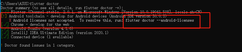 运行flutter doctor —android-licenses指令然后所有的问题都是y就可以了