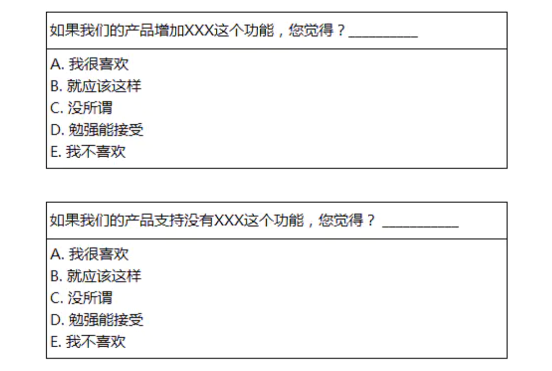 KANO模型是通过问卷调查的方式来确定需求类型的,通过对调查问卷的统计来分析来区分需求。先来看一下问卷的设计: