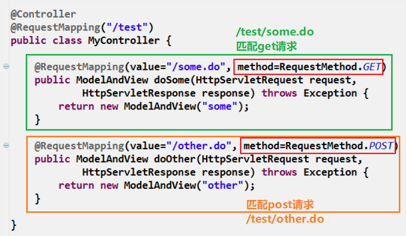 对于@RequestMapping,其有一个属性 method,用于对被注解方法所处理请求的提交 方式进行限制,即只有满足该method属性指定的提交方式的请求,才会执行该被注解方法。 Method 属性的取值为 RequestMethod 枚举常量。常用的为 RequestMethod.GET 与 RequestMethod.POST,分别表示提交方式的匹配规则为 GET 与 POST 提交。