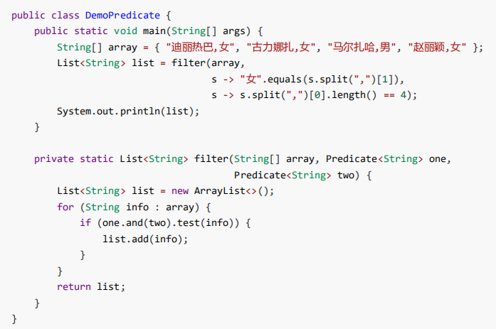 public class Test01Predicate {public static void main(String[] args) {String[] array = { "迪丽热巴,女", "古力娜扎,女", "马尔扎哈,男", "赵丽颖,女" };List<String> lis = filterArray(array,s -> s.split(",")[0].length() == 4,s -> s.split(",")[1].equals("女"));System.out.println(lis);}//必须为女生 并且 姓名为4个字。private static List<String> filterArray(String[] arr, Predicate<String> one,Predicate<String> two) {List<String> li = new ArrayList<>();for (String item : arr) {System.out.println("------->"+item);if(one.and(two).test(item)){System.out.println("==========="+item);li.add(""+item);}}return li;}}