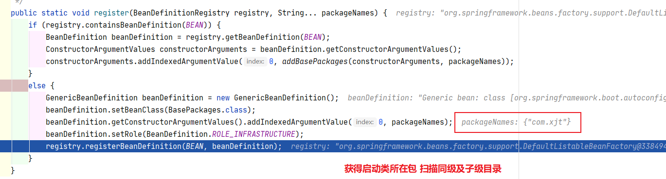 public static void register(BeanDefinitionRegistry registry, String... packageNames) {// 这里参数 packageNames 缺省情况下就是一个字符串,是使用了注解// @SpringBootApplication 的 Spring Boot 应用程序入口类所在的包if (registry.containsBeanDefinition(BEAN)) {// 如果该bean已经注册,则将要注册包名称添加进去BeanDefinition beanDefinition = registry.getBeanDefinition(BEAN);ConstructorArgumentValues constructorArguments = beanDefinition.getConstructorArgumentValues();constructorArguments.addIndexedArgumentValue(0, addBasePackages(constructorArguments, packageNames));}else {//如果该bean尚未注册,则注册该bean,参数中提供的包名称会被设置到bean定义中去GenericBeanDefinition beanDefinition = new GenericBeanDefinition();beanDefinition.setBeanClass(BasePackages.class);beanDefinition.getConstructorArgumentValues().addIndexedArgumentValue(0,packageNames);beanDefinition.setRole(BeanDefinition.ROLE_INFRASTRUCTURE);registry.registerBeanDefinition(BEAN, beanDefinition);}}
