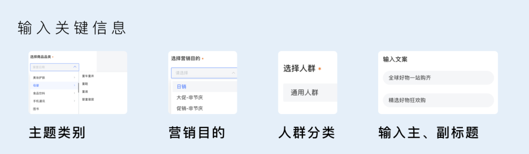 首先我们需要选择配图主题类型、活动类型、人群,这决定了图片风格和商品素材的表现;并输入对应的文案标题,即banner图的文案显示;