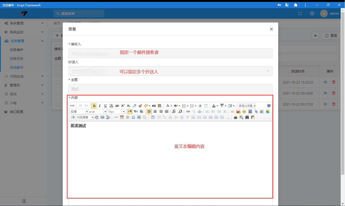 配置成功后启动后效果如下,自动增加了任务维护、任务日志、发送邮件菜单!