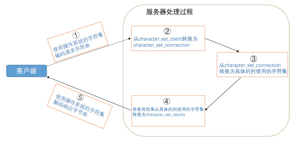 character_set_client编码的。假设你的客户端采用的字符集和 character_set_client 不一样的话,这就会出现意想不到的情况。比如我的客户端使用的是utf8字符集,如果把系统变量character_set_client的值设置为ascii的话,服务器可能无法理解我们发送的请求,更别谈处理这个请求了; - 服务器将把得到的结果集使用