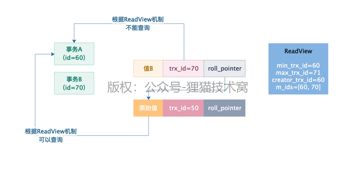 这是必然的,因为ReadView一旦生成了就不会改变,这个时候事务B虽然已经结束,但是事务A的ReadView里,还会有60,70两个事务id,意思是在事务A开启查询的时候,事务B当时是在运行的,接着此时事务A去查询这条数据的值,会发现数据的trx_id是70,70一方面是在ReadView的min_trx_id和max_trx_id的范围区间的,同时还在m_ids列表中。
