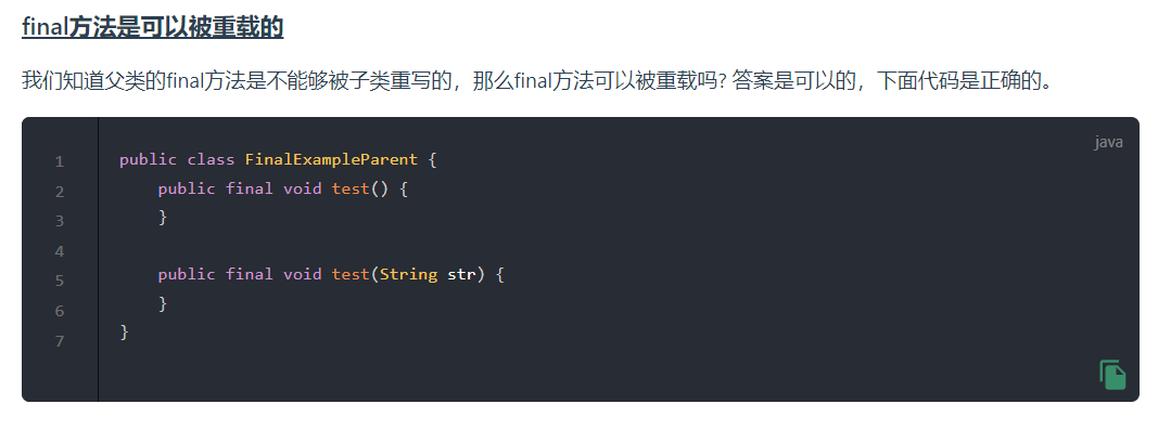 - 被 final 修饰的方法,不能被重写,但是可以被重载