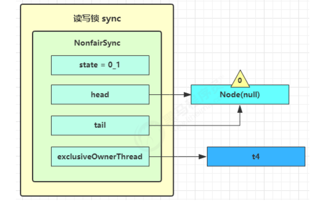 - 这种状态下,假设又有 t3 加读锁和 t4 加写锁,这期间 t1 仍然持有锁,就变成了下面的样子: