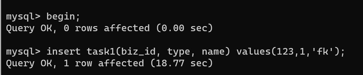 // 关闭自动提交set autocommit = OFF;// 开始事务begin;// 插入表insert task(biz_id, type, name) values(123,1,'fk');// 再开两个会话窗口,执行同样的几步操作,效果如下: