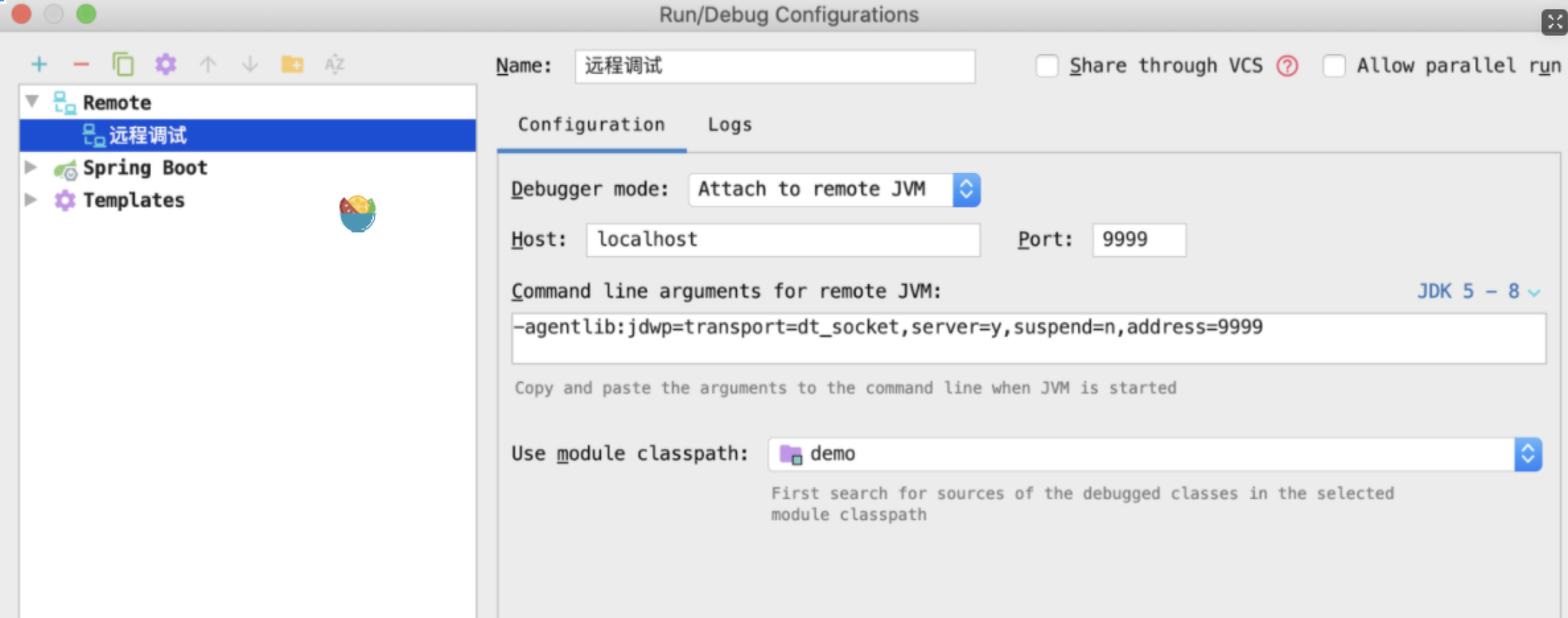 java -agentlib:jdwp=transport=dt_socket, \server=y,suspend=y,address=9999 \-jar xxxx.jar