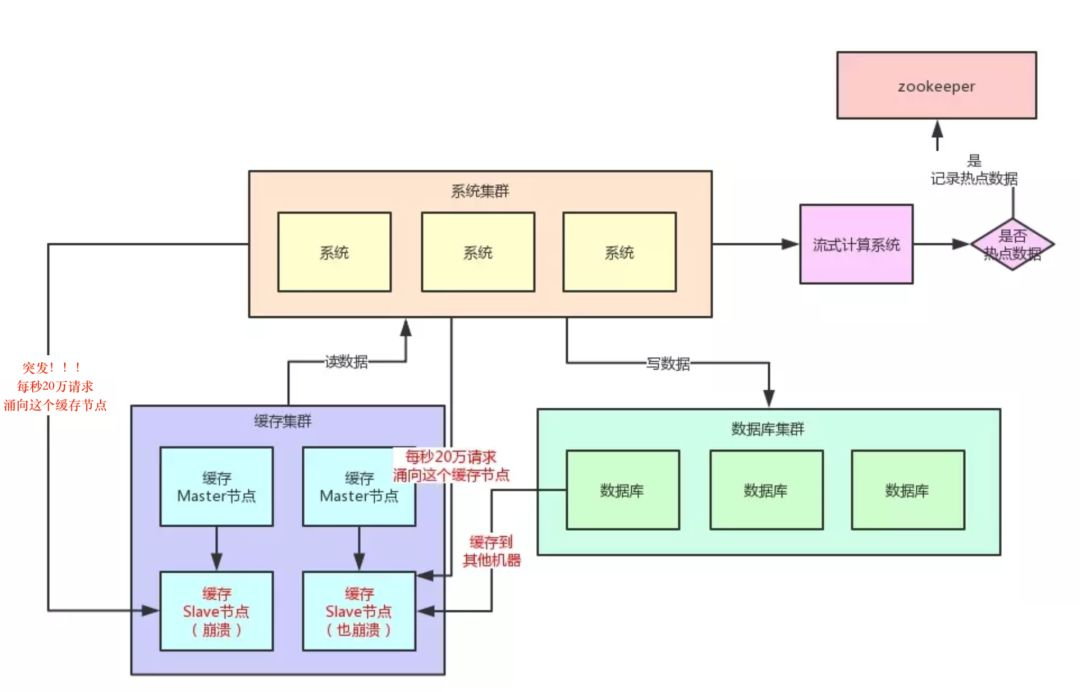 简单来说,假设你手头有个系统,他本身是集群部署的,然后后面有一套缓存集群,这个集群不管你用 Redis Cluster,还是 Memcached,或者是公司自研缓存集群,都可以。