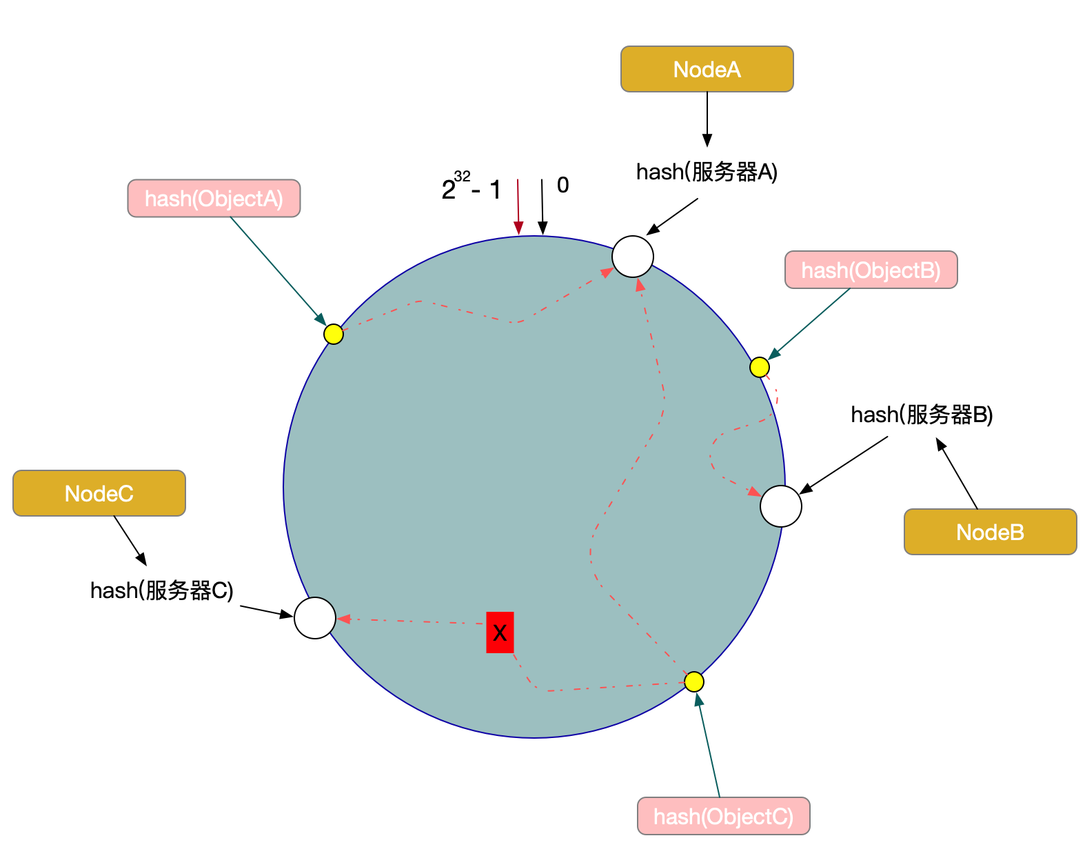 此时对象ObjectA、ObjectB没有受到影响,只有Object C重新定位到了新的节点X上。 如上所述: