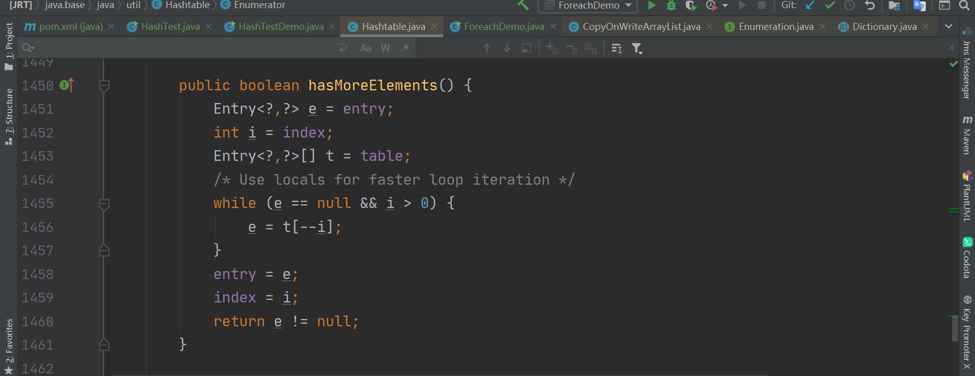 那么为什么不需要抛出这个异常呢?我觉得是因为散列表本就是无序的,因为不需要维护节点间的关系,因此,就算在遍历的时候结构发生了改变,也不会造成重复读取数据和漏读数据的情况。迭代器如下,即使节点被删除了,也不影响遍历剩下的节点。会将其跳过,继续遍历。注意,这里获取的是 key,遍历 key。因为这里遍历时判断是否跳过的条件有 e == null,所以这就是为什么 hashtable 的 key 不可以为 null 的原因